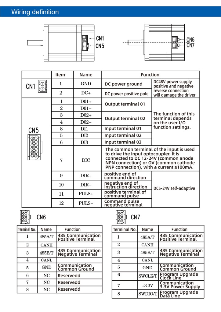 It includes EtherCAT wiring interfaces (via CN7/CN8) for data transmission, plus I/O terminals (CN5) for signals like servo ready, fault alarm, and emergency stop. Ideal for applications needing precise positioning, fast communication, and compact integration.