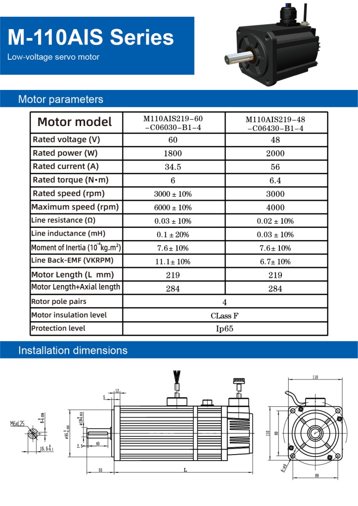 - M110AIS219-48 (2000W): 48v, 56あ (rated), 6.4N・m (rated); 3000回転数 (rated)/4000回転数 (最大); back-EMF 6.7VKPRPM.