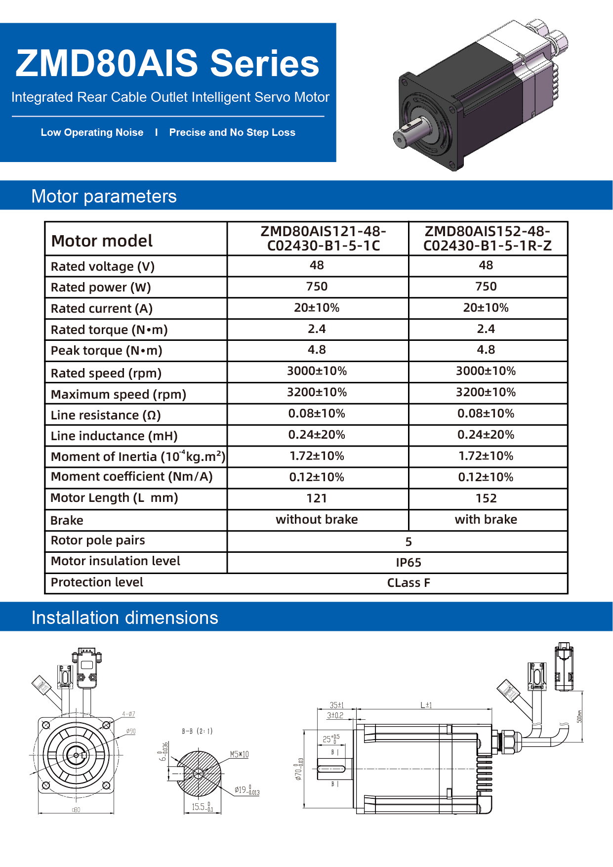 - Models (ZMD80AIS121/152): 48V, 750C, 20UM; 2.4Torque nominal N·m (4.8N·m peak); 3000velocidade nominal rpm (max 3200rpm).