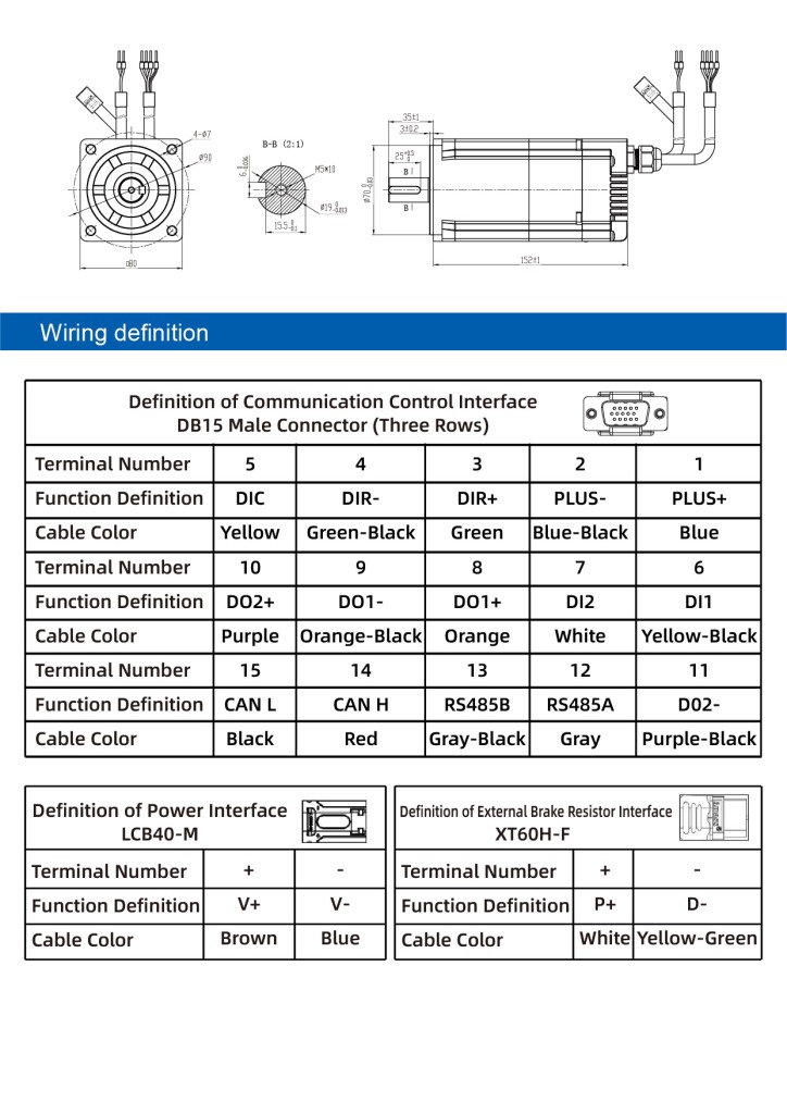 - Interfaces: DB15 communication (supports CAN/RS485), LCB40-M power, and XT60H-F brake resistor port.